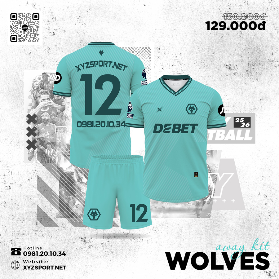 Away Kit Wolves 25/26 – Thiết kế xanh ngọc thời thượng, chất liệu thể thao cao cấp, hoàn hảo cho cả thi đấu và tập luyện mỗi ngày.