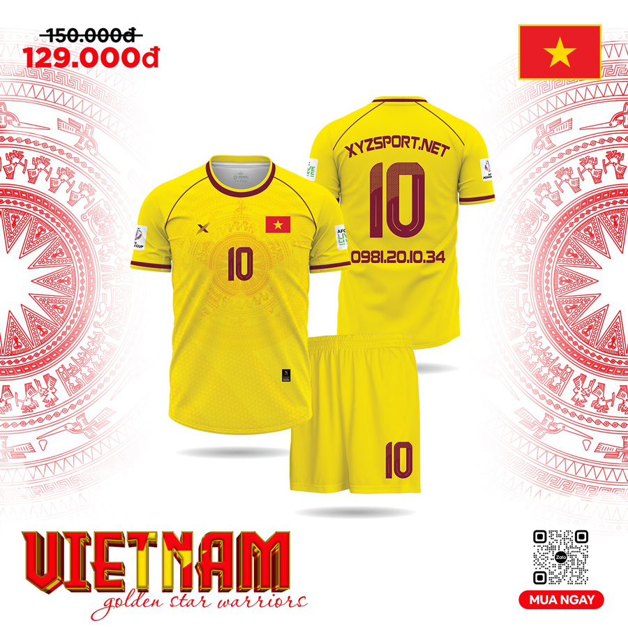 Sở hữu ngay mẫu áo đấu đội tuyển Việt Nam nổi bật với màu vàng tươi tượng trưng cho chiến thắng, thiết kế đậm bản sắc dân tộc và chất liệu thể thao cao cấp.