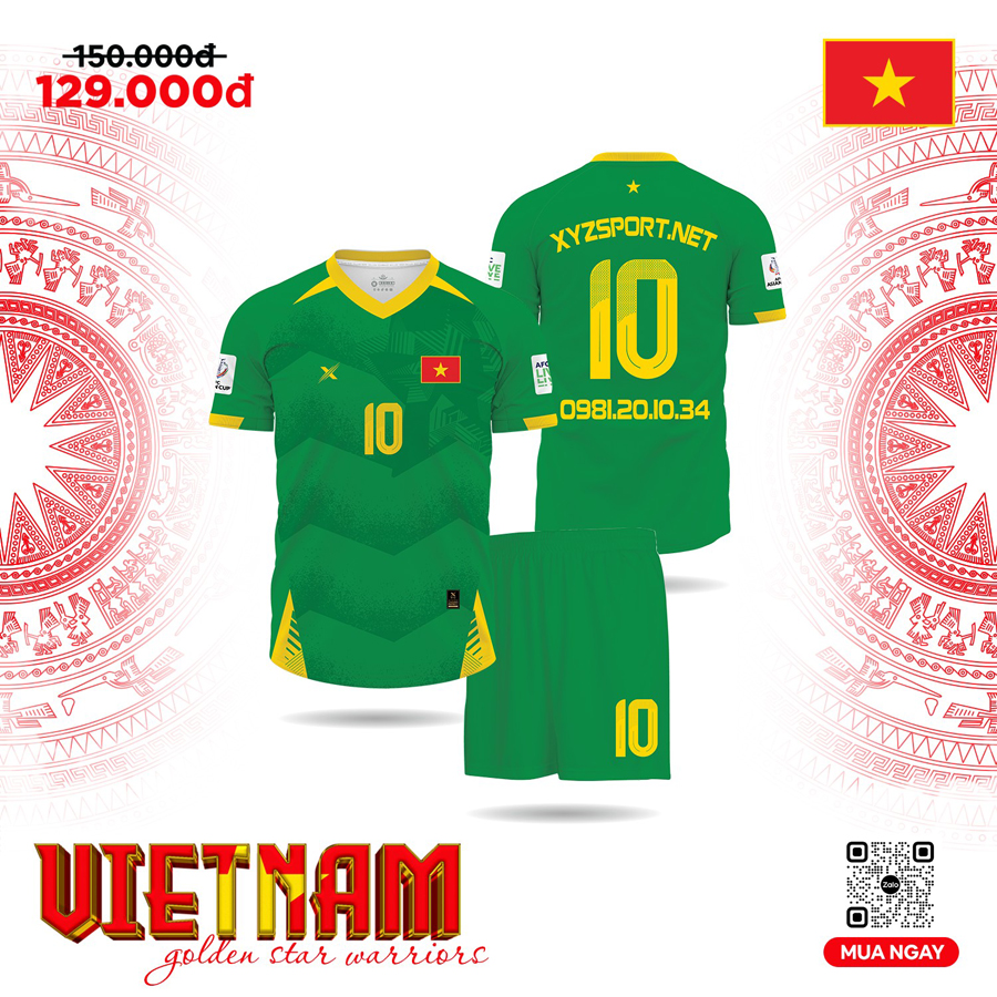 Điểm nhấn là các chi tiết màu vàng nổi bật ở cổ áo, tay áo và họa tiết hai bên hông. Sự kết hợp giữa xanh và vàng tạo nên hiệu ứng thị giác mạnh mẽ, thu hút ánh nhìn mà vẫn hài hoà. Đặc biệt, phía ngực trái được đính kèm lá cờ Việt Nam – biểu tượng của tình yêu nước, khơi lên lòng tự hào dân tộc và cổ vũ tinh thần thể thao Việt Nam.