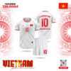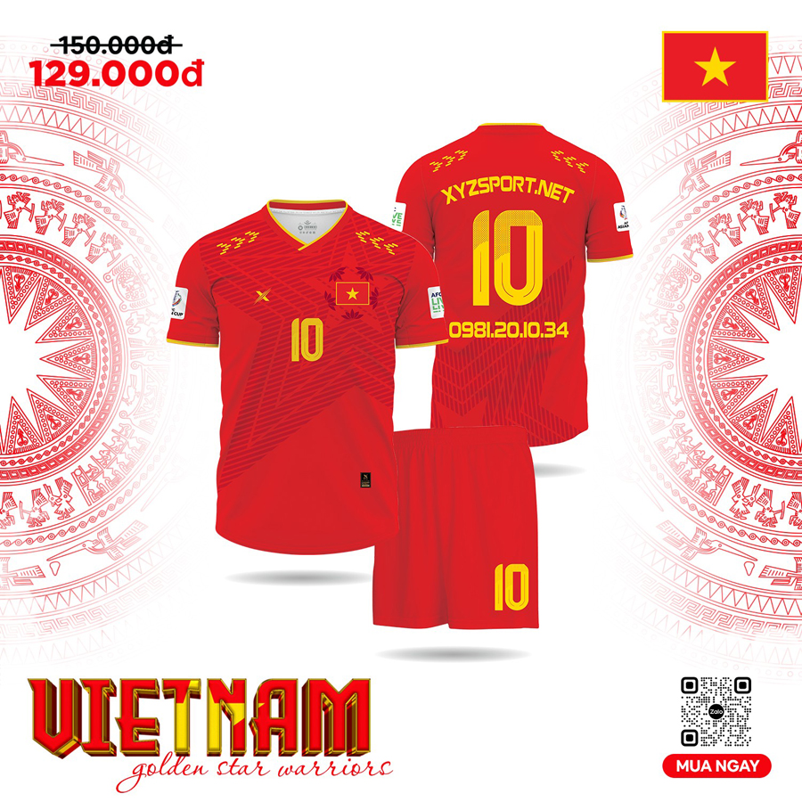 Bộ quần áo bóng đá đội tuyển Việt Nam với tông màu đỏ truyền thống chính là biểu tượng mạnh mẽ cho tinh thần bất khuất, niềm tự hào và lòng yêu nước của mỗi người con đất Việt. Toàn bộ thiết kế tôn vinh màu sắc quốc gia, kết hợp hài hòa với các chi tiết màu vàng như số áo và đường viền, gợi hình ảnh của lá cờ đỏ sao vàng mà mỗi cổ động viên luôn mang theo trong tim.