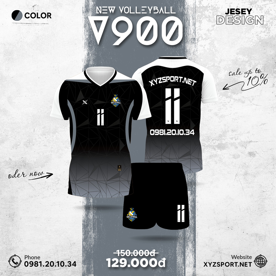 Áo bóng chuyền V900 mang tông màu đen – xám than chủ đạo, kết hợp hiệu ứng gradient và họa tiết tam giác 3D, không chỉ mang lại cảm giác thể thao chuyên nghiệp mà còn có khả năng thấm hút, co giãn tối ưu dành cho cả nam và nữ.