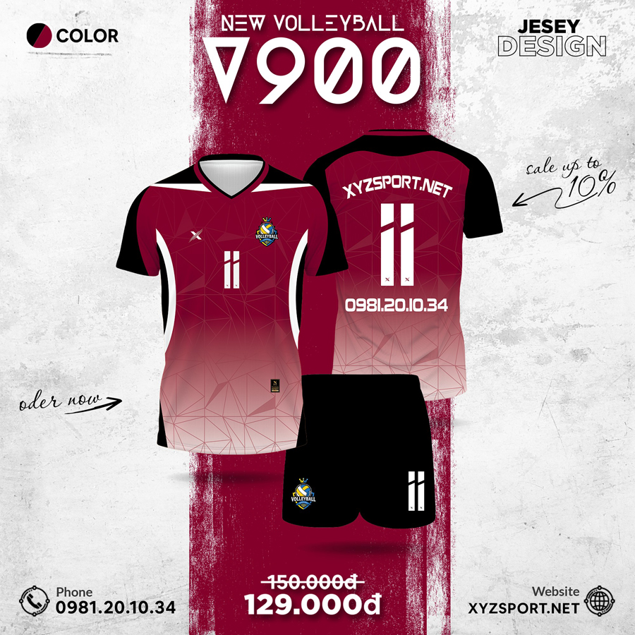 Đồng phục bóng chuyền V900 phiên bản màu đỏ đô – Thiết kế hiện đại, hiệu ứng chuyển sắc ấn tượng, ôm dáng thể thao, thấm hút nhanh – lựa chọn tối ưu cho những đội bóng muốn vừa thi đấu chuyên nghiệp vừa nổi bật trên sân.